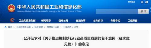 为明确机制砂石产业方向,引导机制砂石行业优化发展布局,促进机制砂石行业高质量发展,受工业和信息化部委托,中国砂石协会组织专家编制了《关于推进机制砂石行业高质量发展的若干意见(初稿)》。日前,中华人民共和国工业和信息化部原材料工业司发布《关于推进机制砂石行业高质量发展的若干意见(征求意见稿)》,并公开征求意见。
